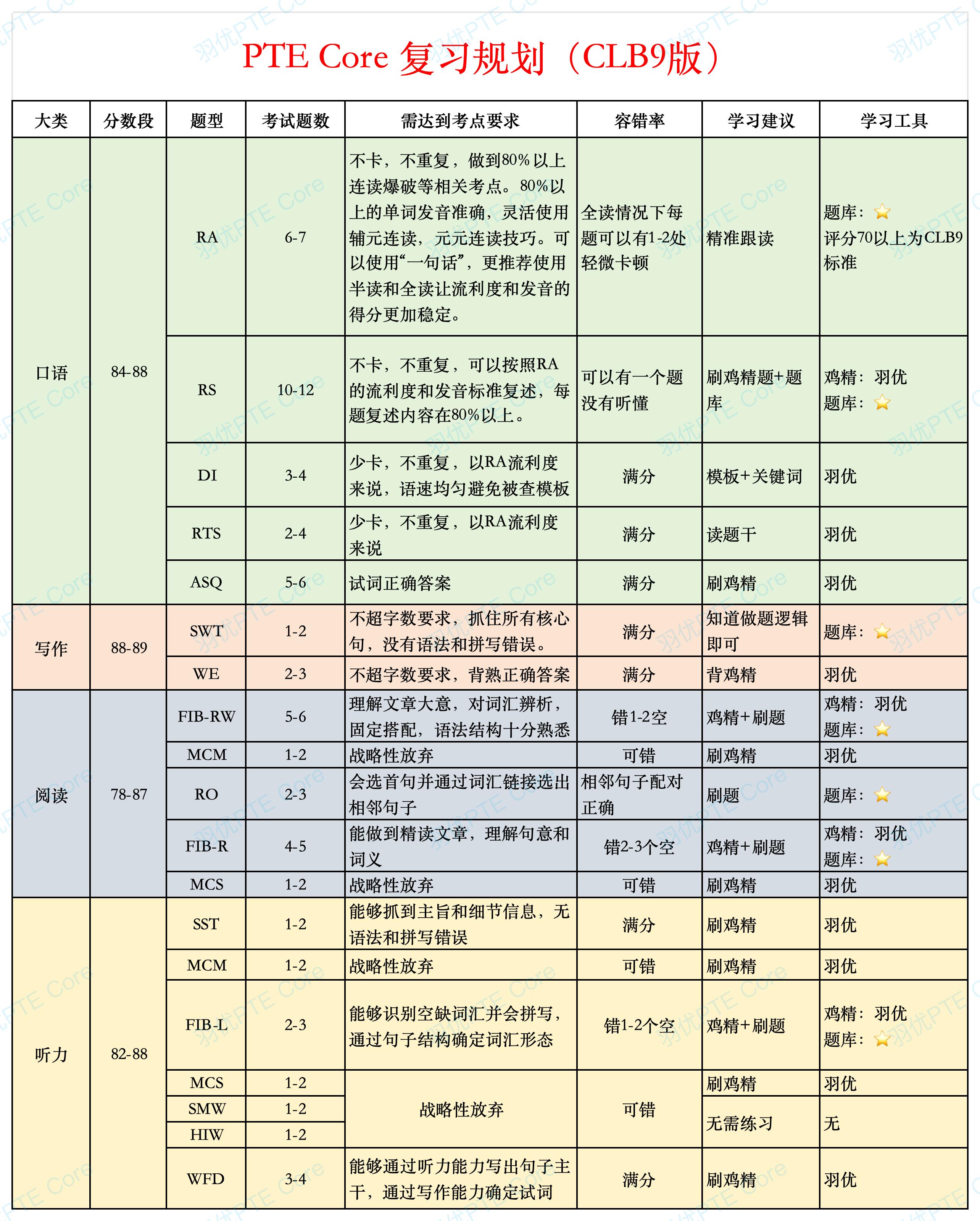 这篇文章我就带大家揭秘PTE Core的CLB9复习方法。篇幅问题我只解读重点题型,其他的大家可以与图表结合着看: